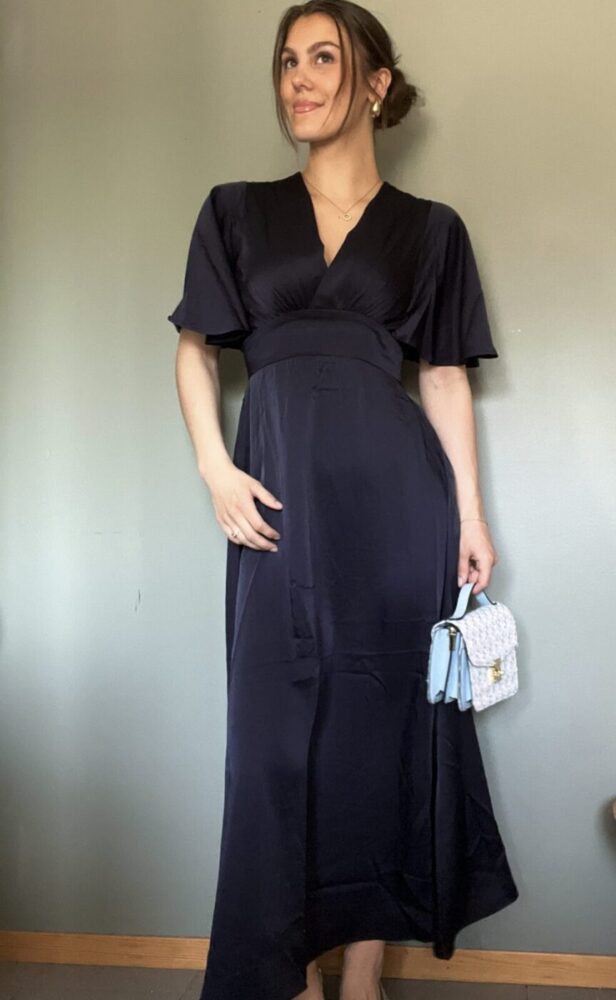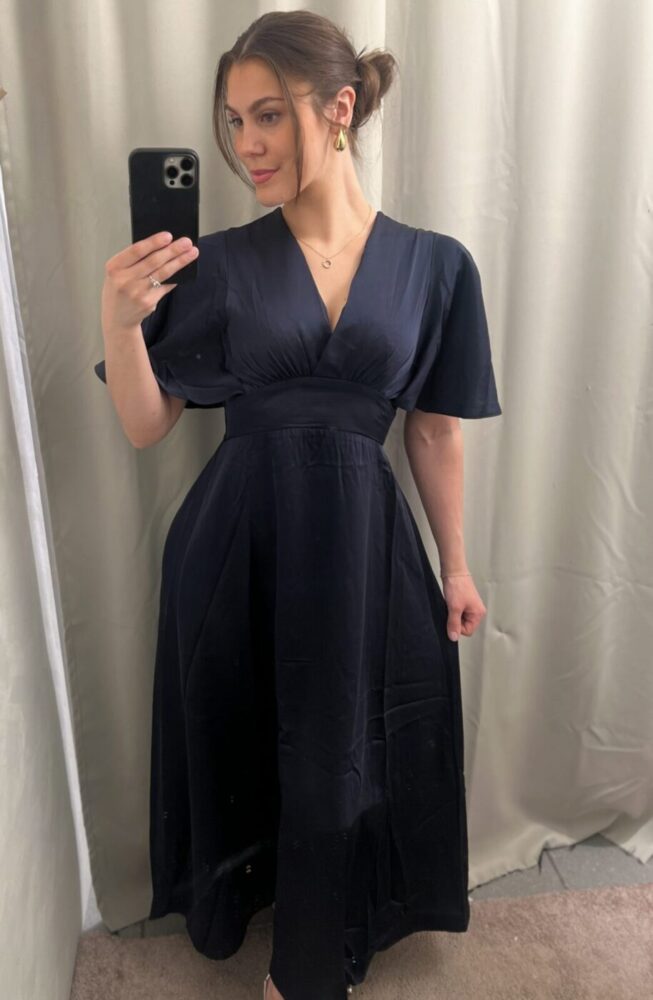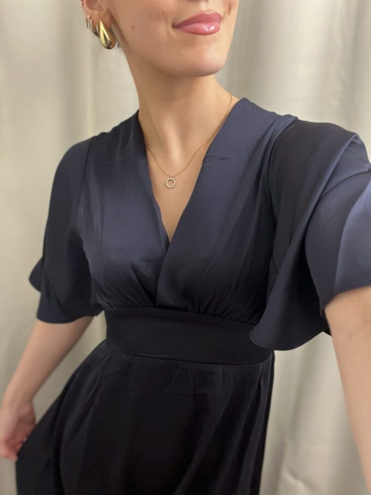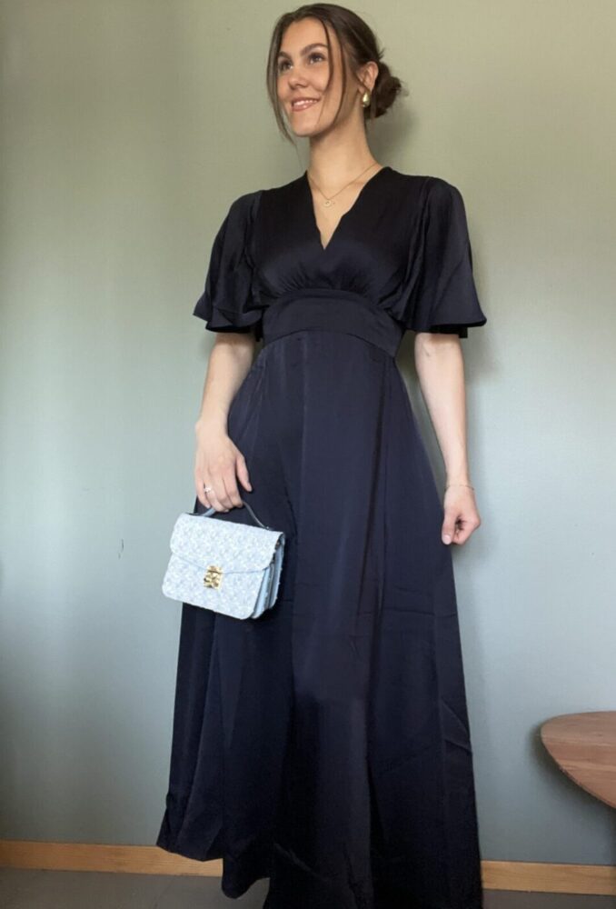 Flowy Satin dress er en lekker og festlig kjole med flotte detaljer. Den har en feminin pasform med strikk på ryggen som gjør at den sitter fint og behagelig på. Kjolen har v-utskjæring og løse ermer.
