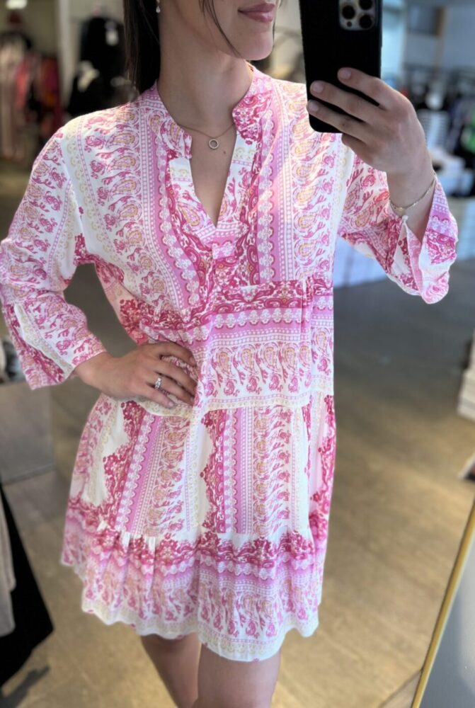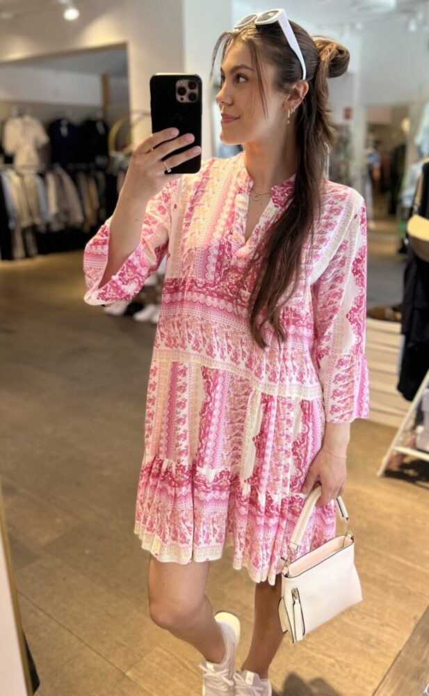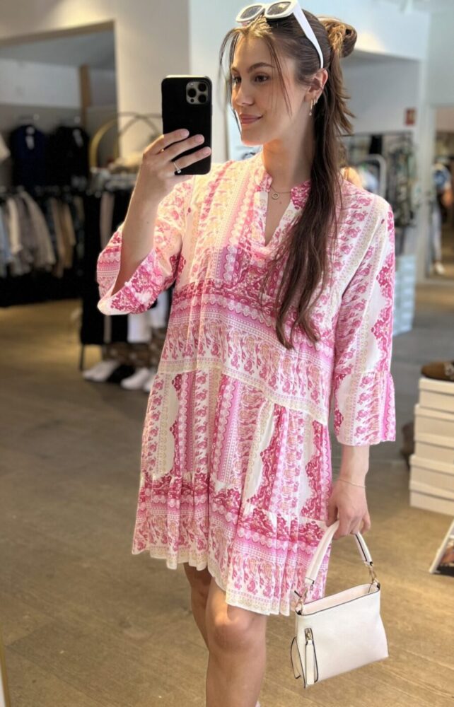 Lekker og lett sommerkjole man kan pynte opp og ned Lekende print med en a-shaped form som sitter løst og ledig på. Super komfortabel!