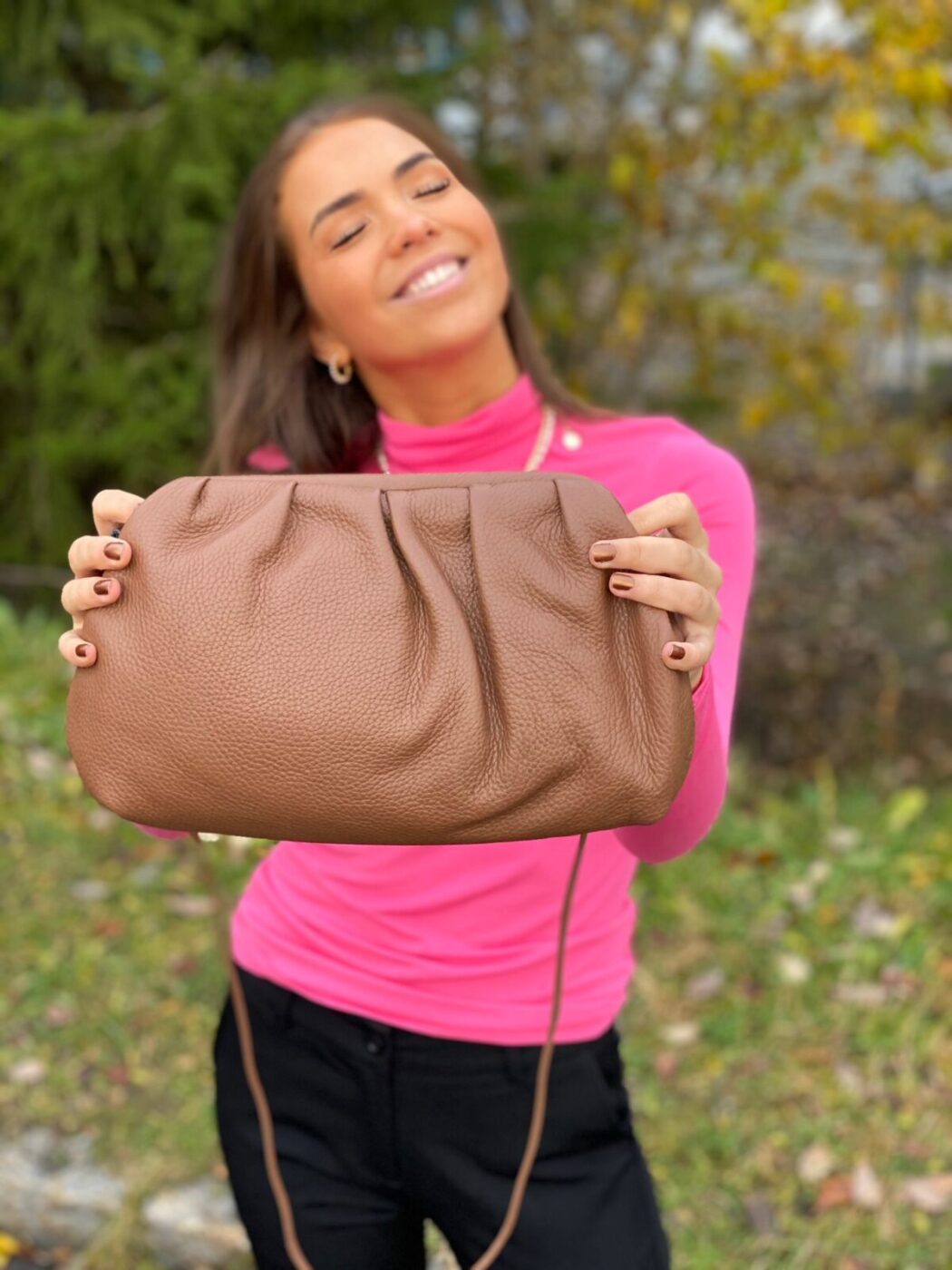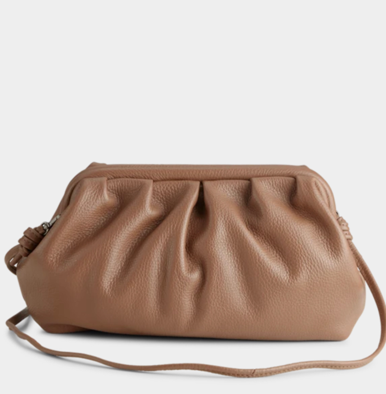Kan brukes både som clutch og crossbody bag. Stort rom innvendig. Glidelåslomme innvendig To små lommer innvendig. Pungramme som lukkes. Avtagbar crossbody-stropp.