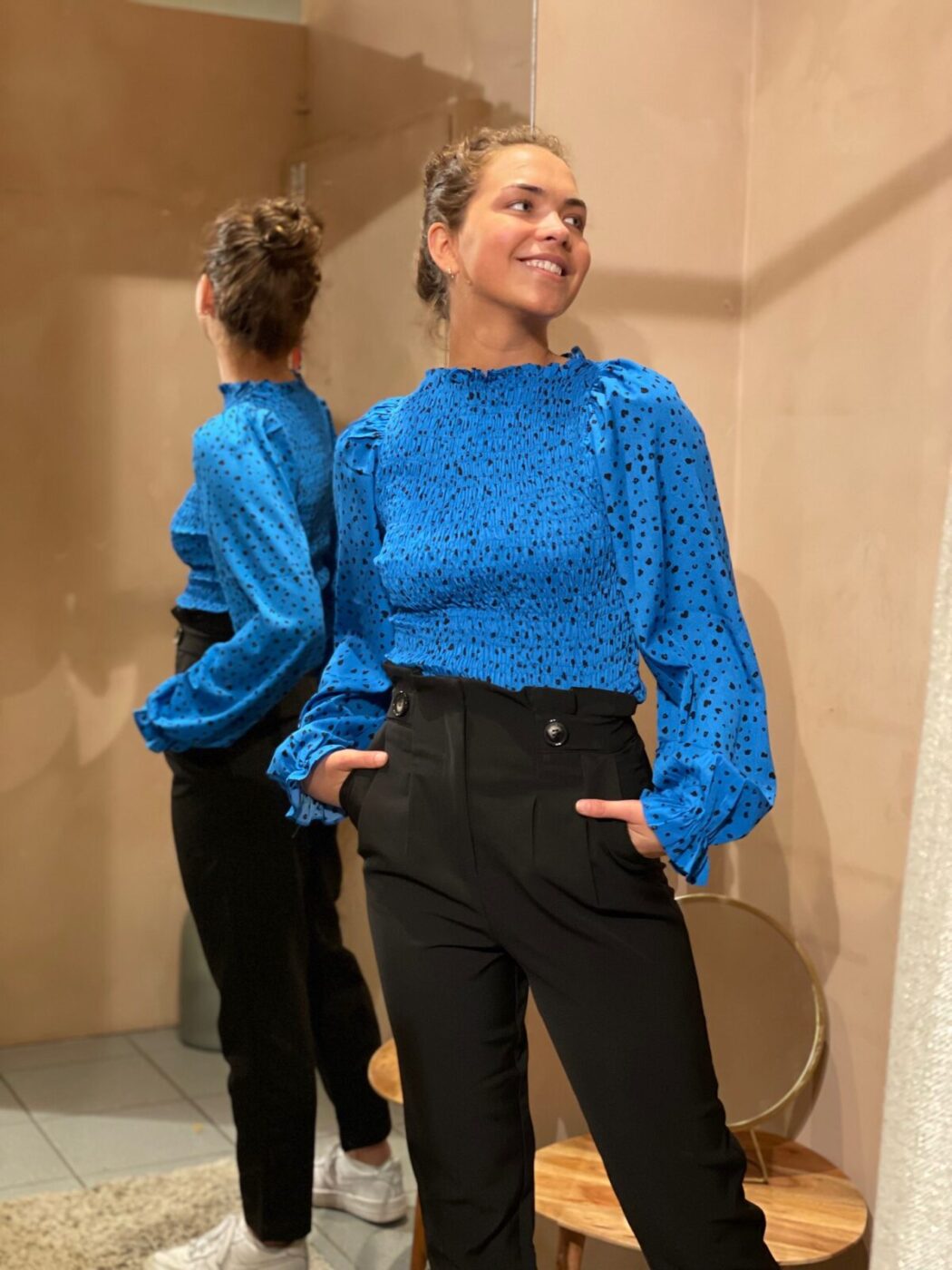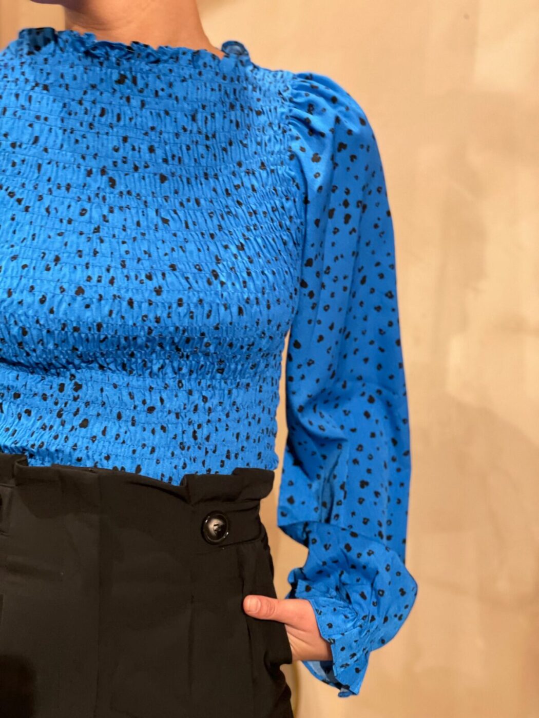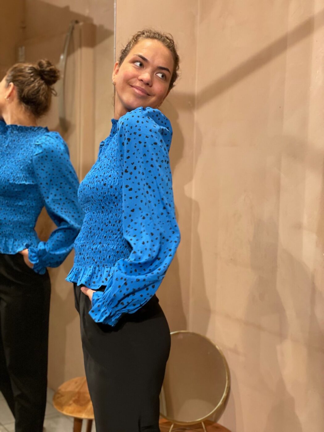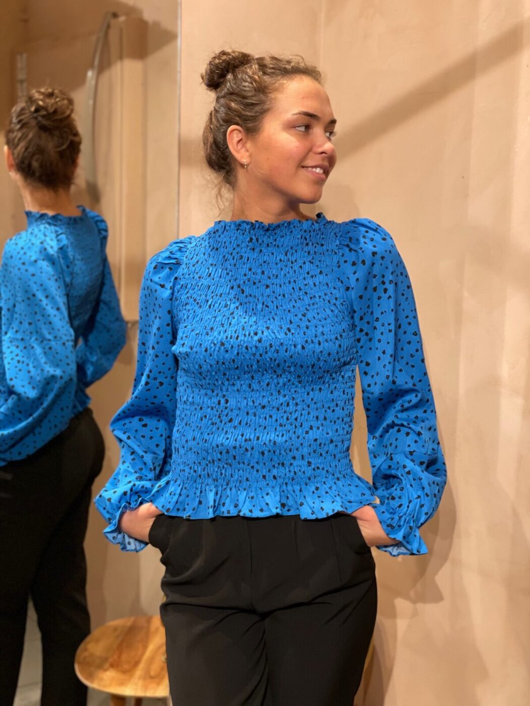 Dette er en feminin bluse med kort passform. Blusen har en rund hals, med lange og elastiske armer. Gå gjerne opp en størrelse om du vipper mellom to.