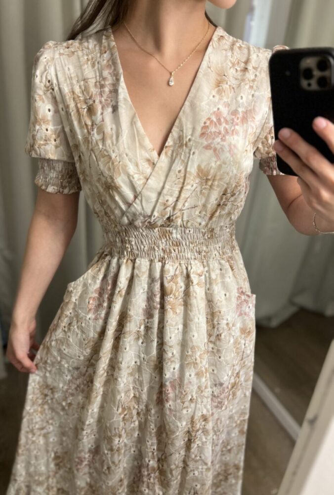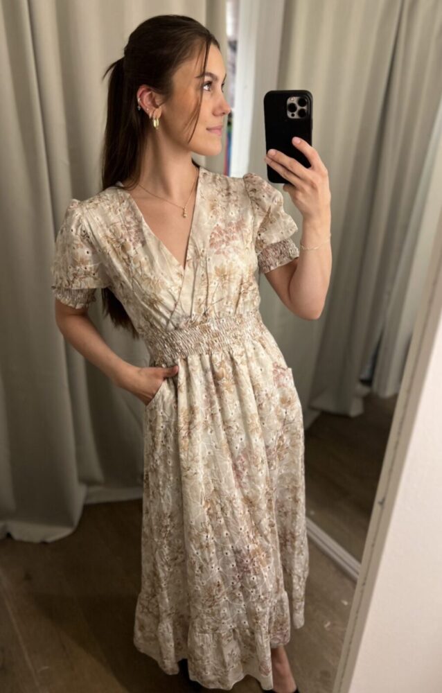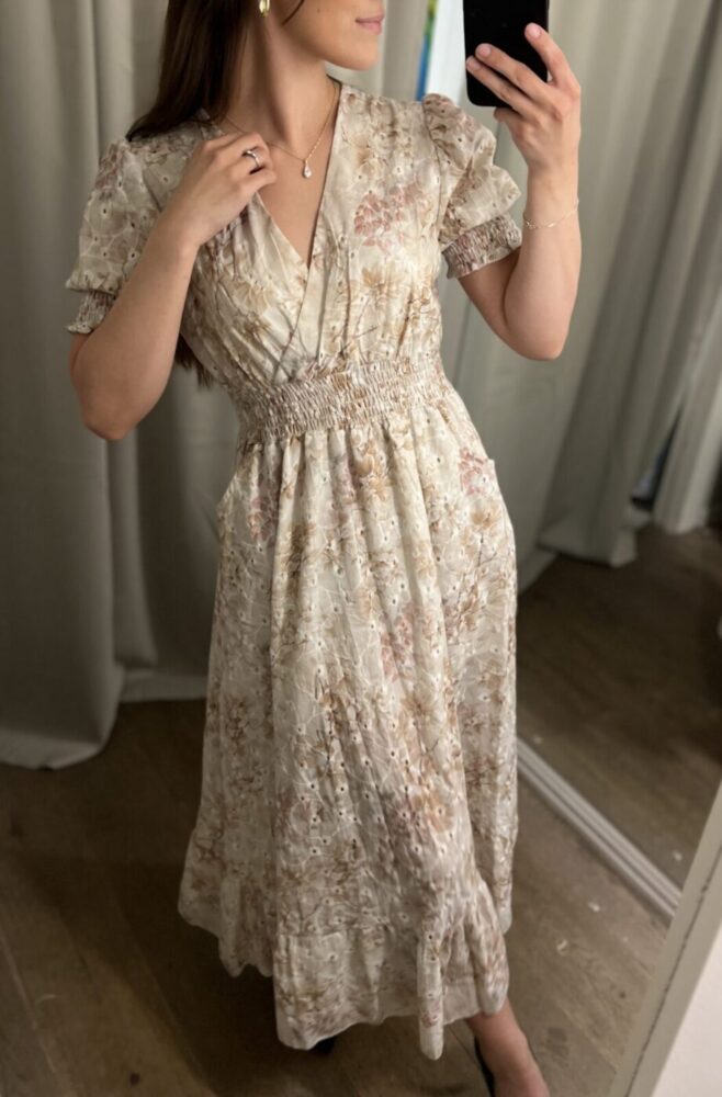 Fineste kjolen med lommer og delikat print  har kommet i butikk og nettbutikk nå! Denne har strikk i livet som gir kjolen et fint fall, samtidlig som den er komfortabel å ha på Perfekt til bryllupssesongen som er nå!