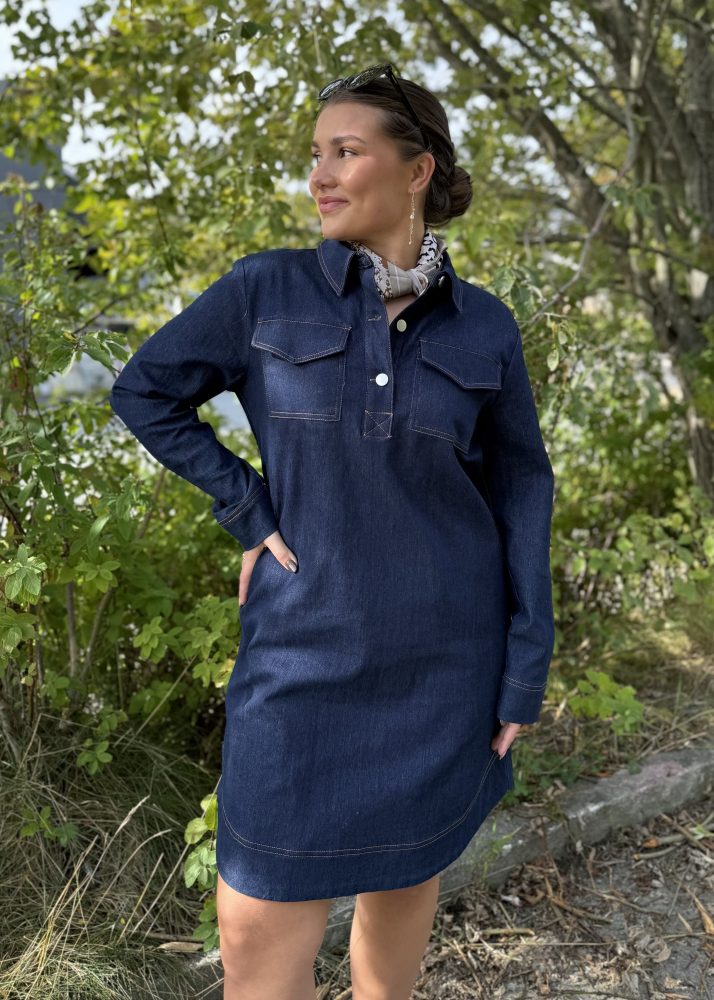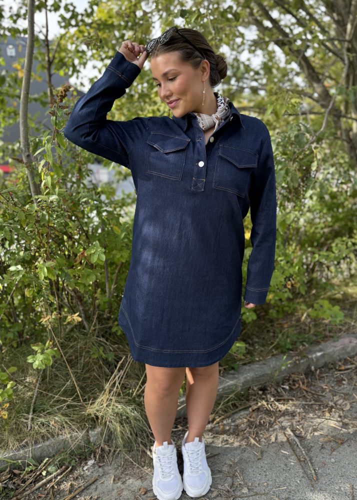Lekker dongerikjole som fint kan pyntes opp og ned til hverdags! Nydelig mørk blå denim som er veldig trendy. Modellen har på str L. Normal til liten i størrelsen.