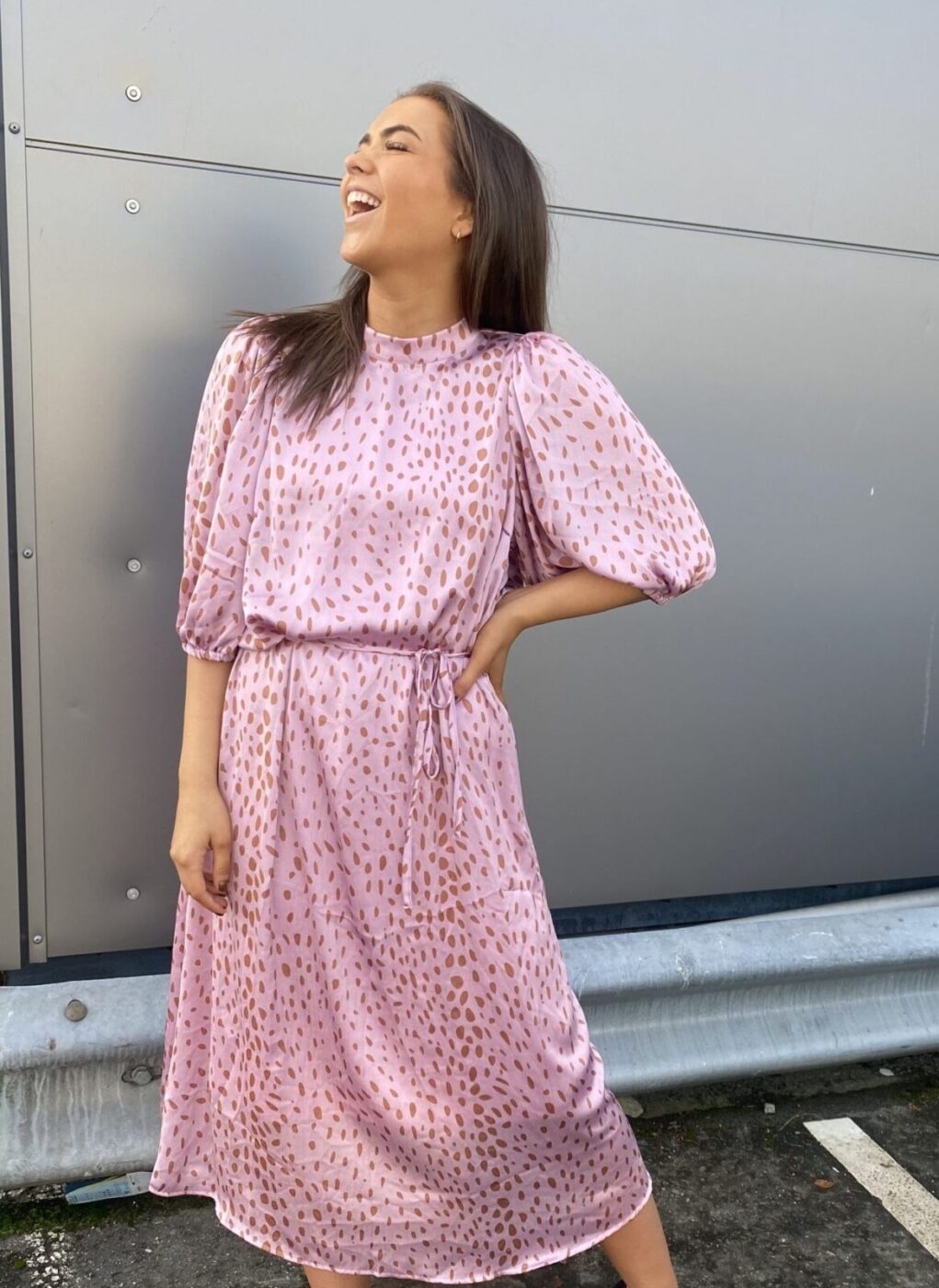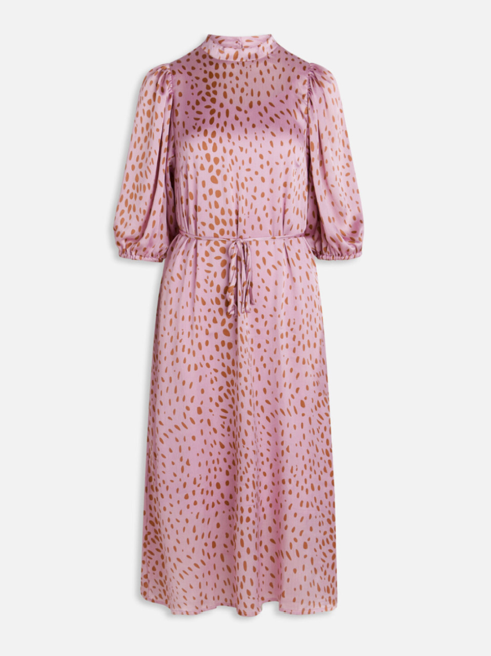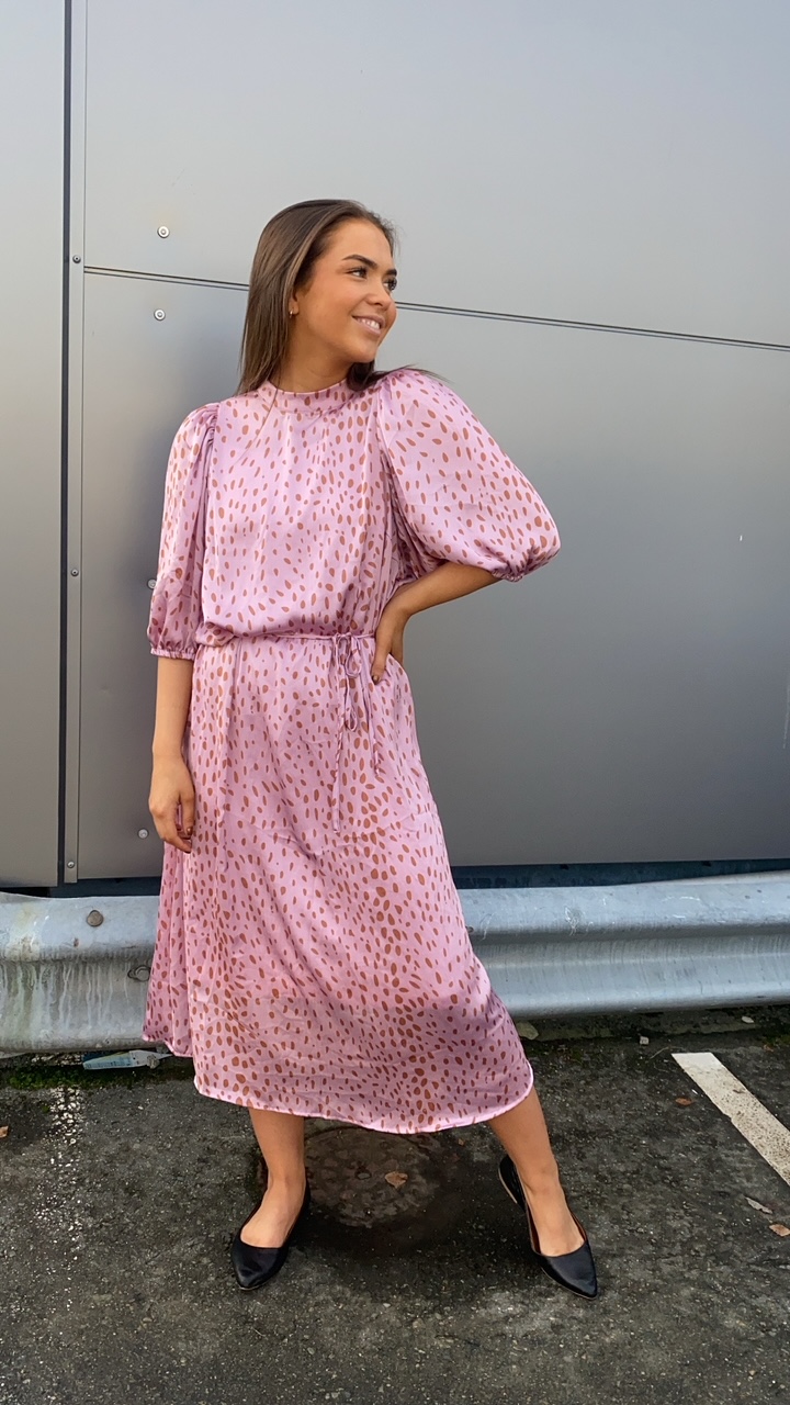 Vendela Dress er en lang satinkjole med et aftageligt bånd i taljen og trekvartlange pufærmer.