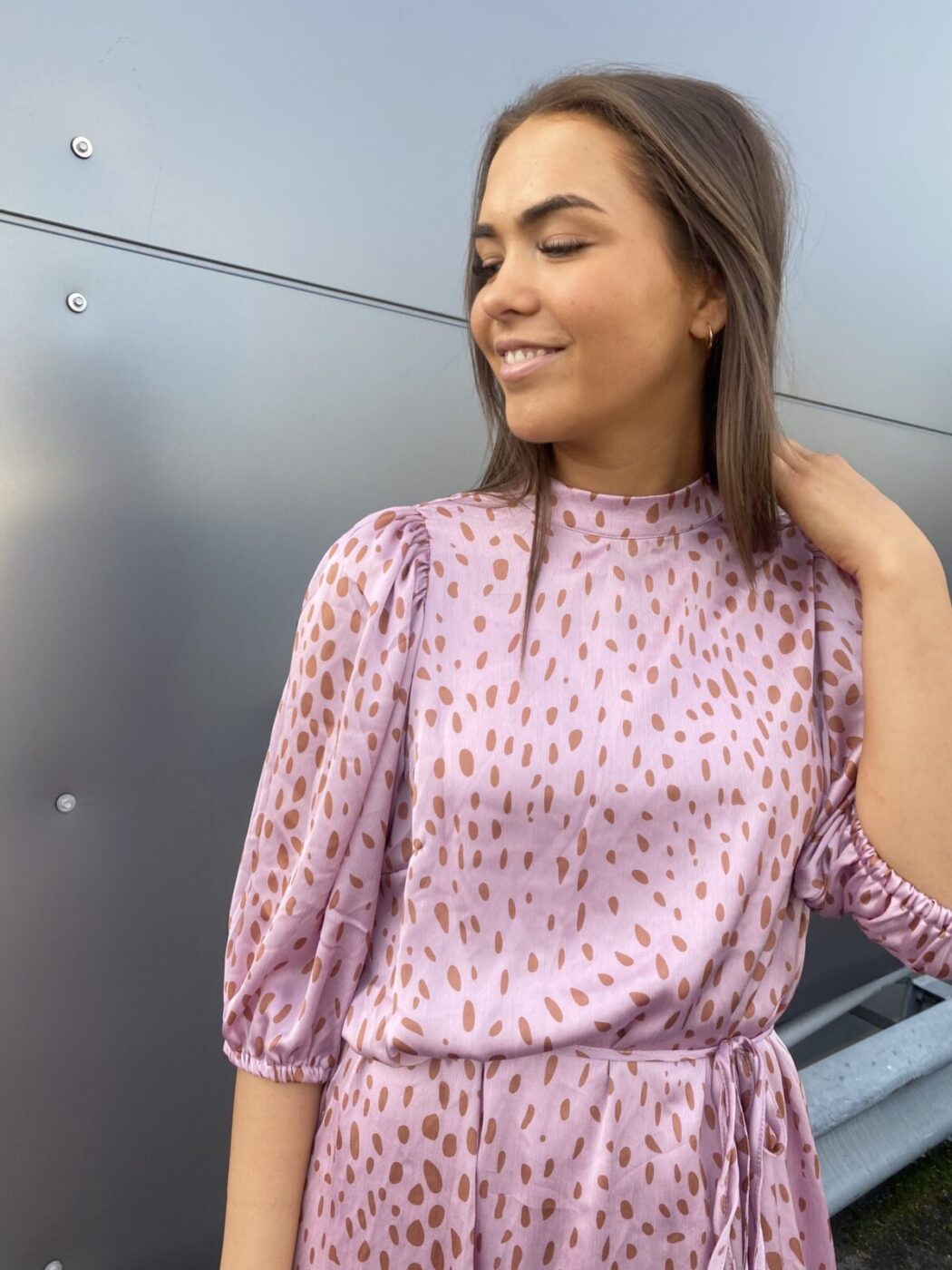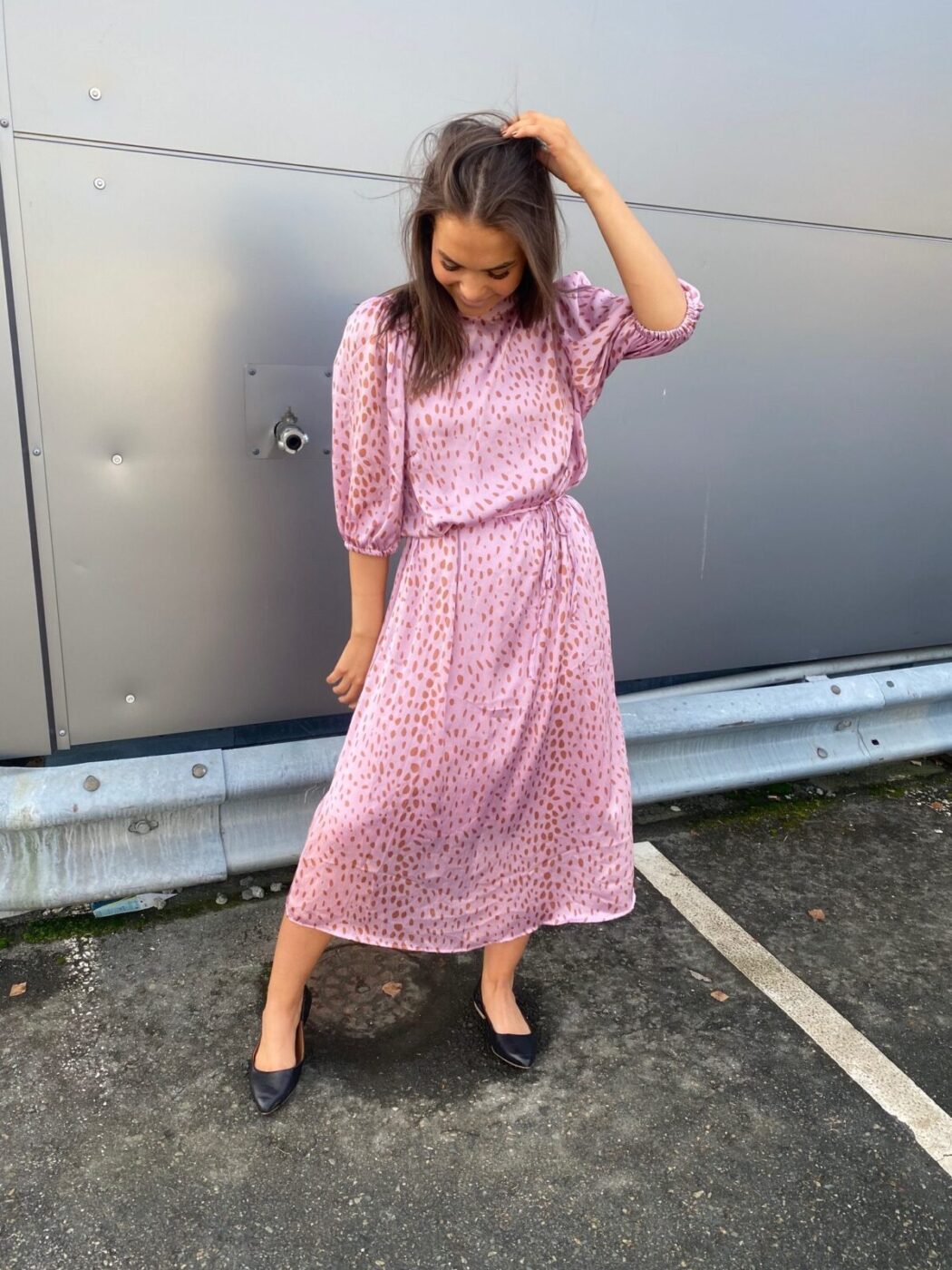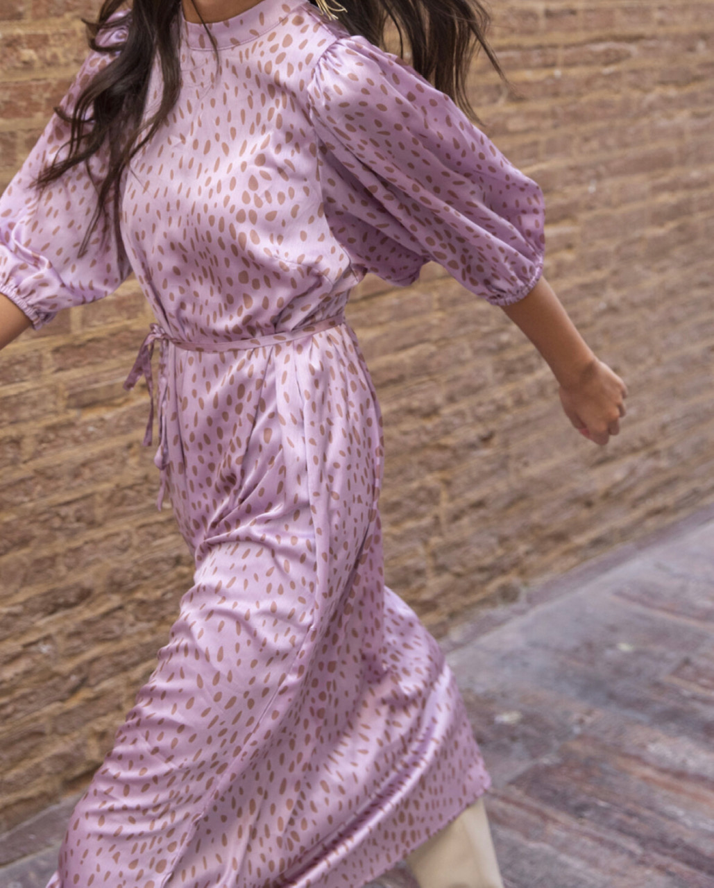 Vendela Dress er en lang satinkjole med et aftageligt bånd i taljen og trekvartlange pufærmer.